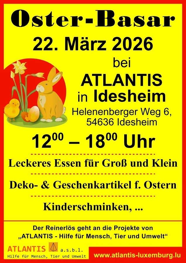 Einladung zum Oster-Basaram 22. März 2026, 12 – 18 Uhr bei ATLANTIS in Idesheim, Helenenberger Weg 6, 54636 Idesheim