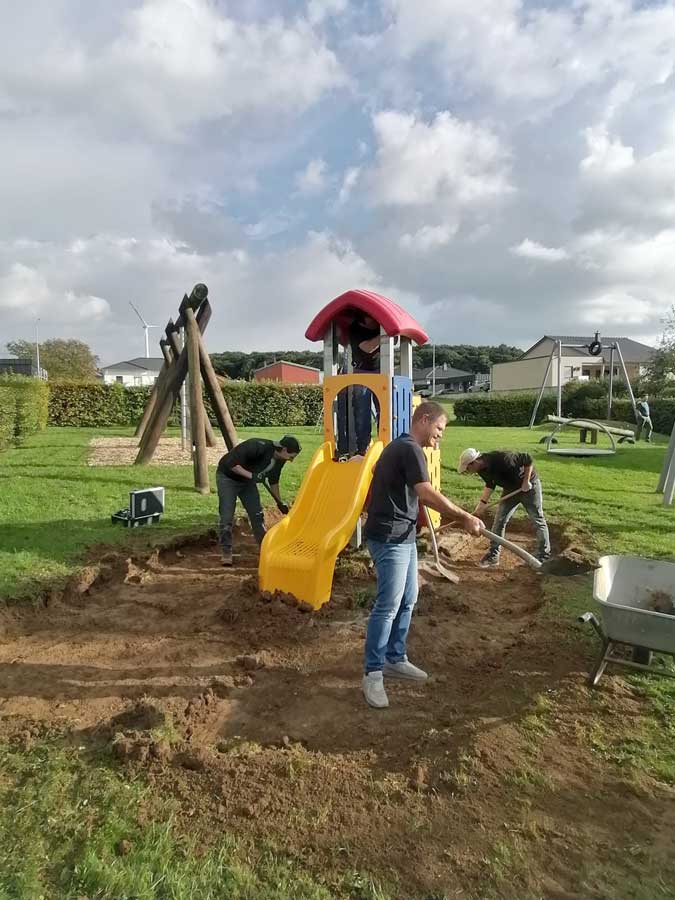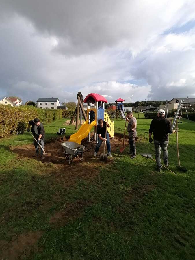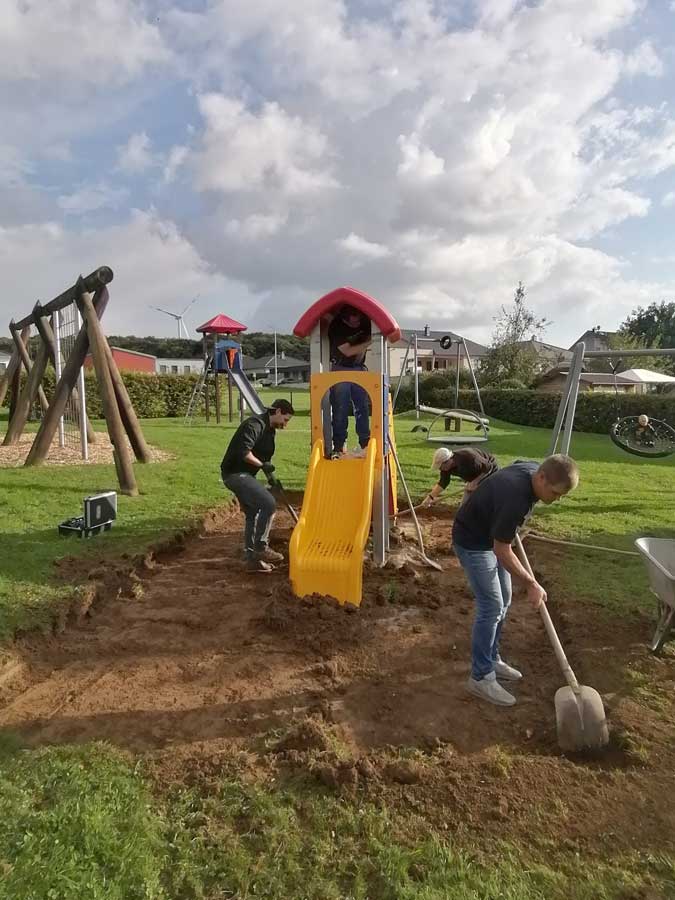 Auch der Aufbau der Rutsche war ein echtes Gemeinschaftsprojekt. Mitgeholfen haben Daniel Hoor - unser Westnetzpate -, junge Papas, Opas und Omas. Dank auch an Die Dienstleister, die uns mit Kraft und Maschinen unterstützt haben.