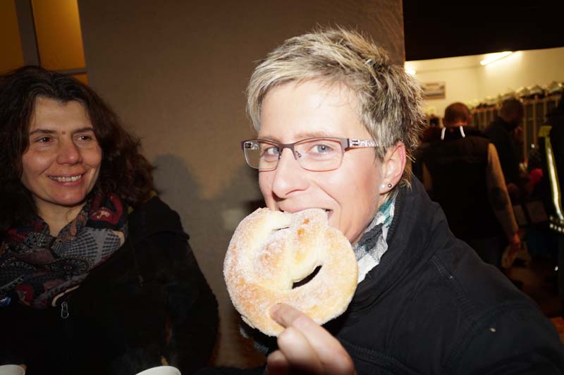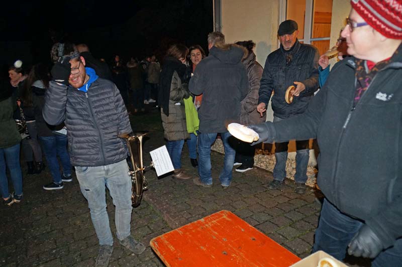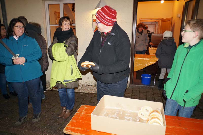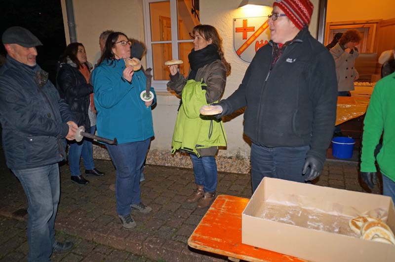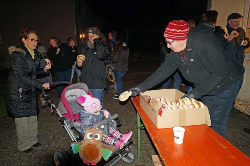 Am Gemeindehaus Gilzem angekommen, wartete schon Ortsbürgermeisterin Martina Thies mit leckeren Martinsbrezeln, verteilte sie an Klein und Groß.