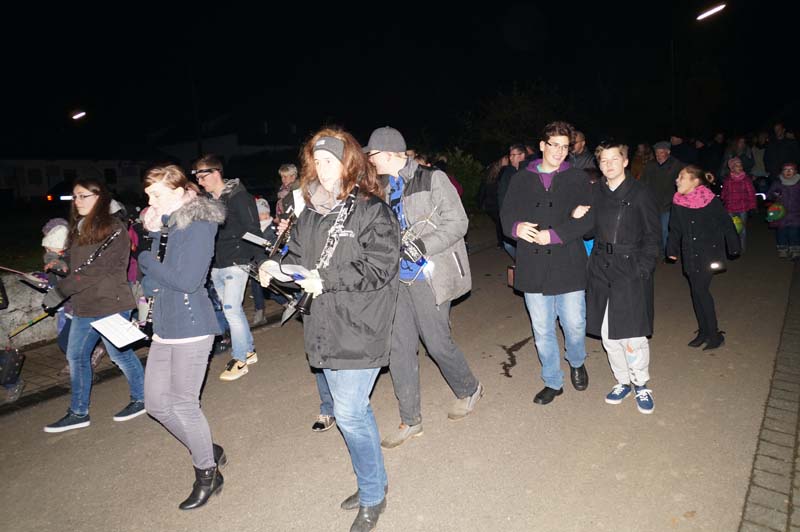 Begleitet und gesichert durch die Fackelträger der Freiwilligen Feuerwehr, dem Spiel der Eisenacher Musikanten und den Martinsgesängen der rd. 150 Teilnehmern führte der Weg am Martinsfeuer vorbei durch die Gilzemer Straßen.