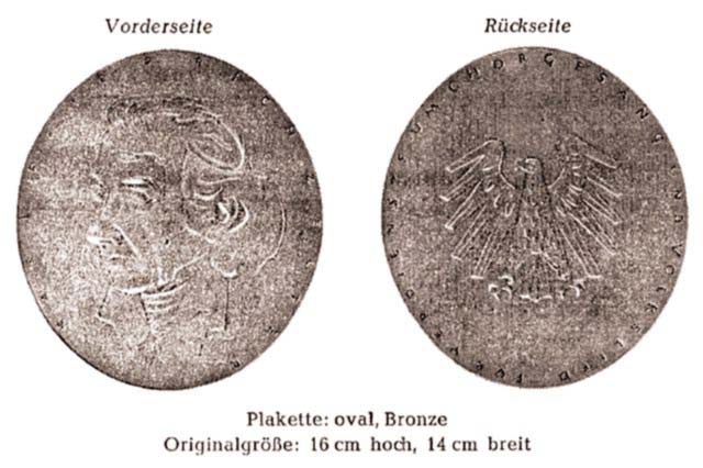 Die Plakette ist hochoval, hat die Maße: 16 cm (Höhe) x 14 cm (Breite) und besteht aus Bronze. Sie zeigt auf ihrer Vorderseite das Bildnis Carl Friedrich Zelter (1758–1832) – Gründer der ersten Liedertafel und Direktor der Sing-Akademie zu Berlin und auf der Rückseite den Bundesadler mit der Umschrift: Für Verdienste um Chorgesang und Volkslied.(Quelle: Wikipedia) Zugriffe: 6595