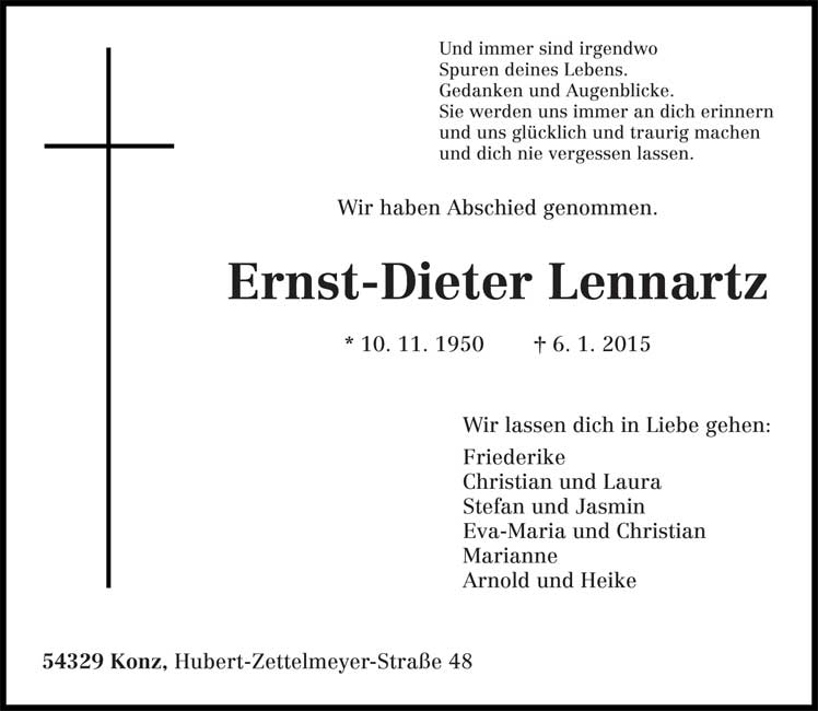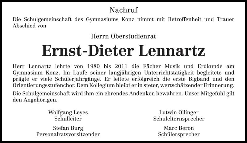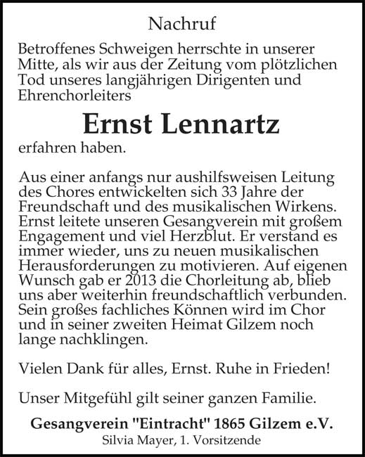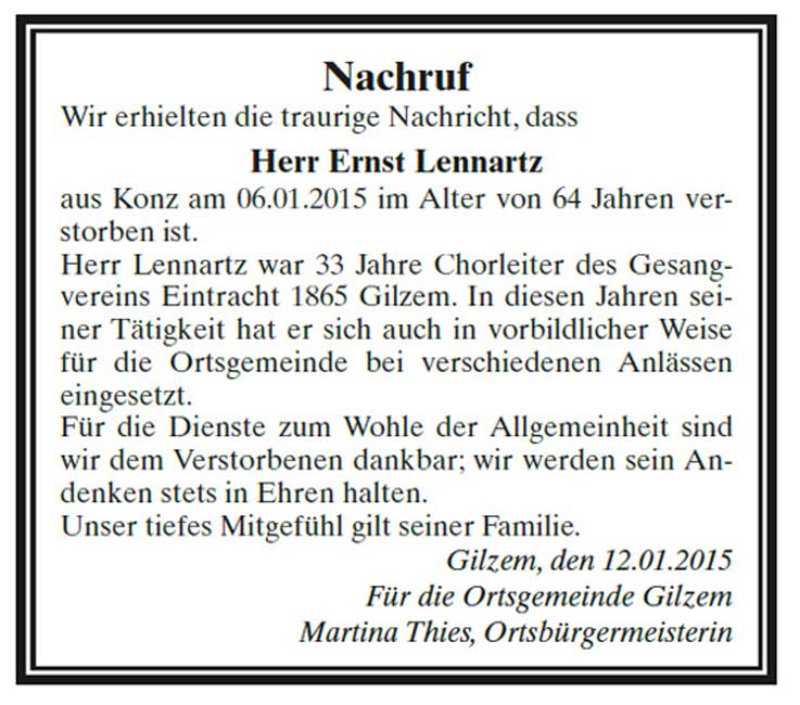 Vom 26.9.1980 bis Juni 2013 war Ernst Lennartz Chorleiter des Gesangvereins "Eintracht" 1865 Gilzem. Aus der Leitung des Chores entwickelten sich 33 Jahre der Freundschaft und des musikalischen Wirkens. Gilzem wurde für Ernst zur zweiten Heimat. Gesangverein Gilzem und Gemeinde Gilzem danken Ernst Lennartz für die vielen schönen Jahre in musikalischer und freundschaftlicher Verbundenheit. Vielen Dank für alles, Ernst. Ruhe in Frieden! Zur Erinnerung nachfolgend die Anzeigen im Trierischen Volksfreund und dem Mitteilungsblatt der Verbandsgemeinde Südeifel: