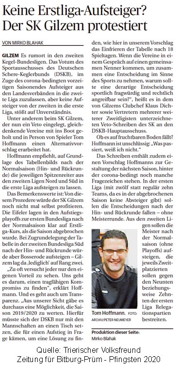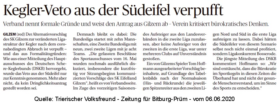 - Am 30.05.2020 nimmt der DSKB-Hauptausschuss diesen Vorschlag zur Kenntnis, diskutiert wohl auch darüber, bestätigt aber letztlich den Beschluss des DSKB-Sportausschusses vom16.05.2020, die komplette Saison 2019/20 für die Bundesligamannschaften zu annullieren. (Link zum Beschluss-PDF 369 kb) Lesen Sie hierzu auch den Artikel im Trierischer Volksfreund vom 06.06.2020: Kegler-Veto aus der Südeifel verpufft (JPG 113 kb)
