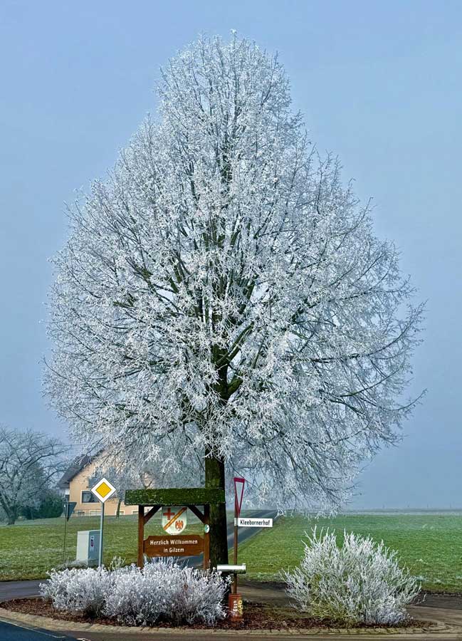 Gilzem - Ortseingang vom Helenenberg kommend - Januar 2025 (Foto: Frank Gangolf)Im frost'gen Glanz, am Dorfrand hier,