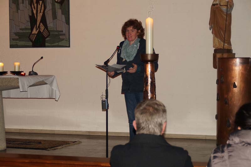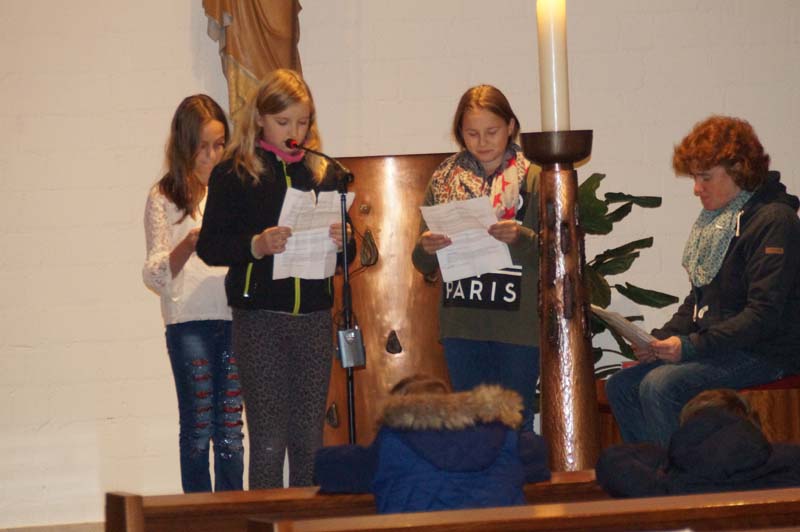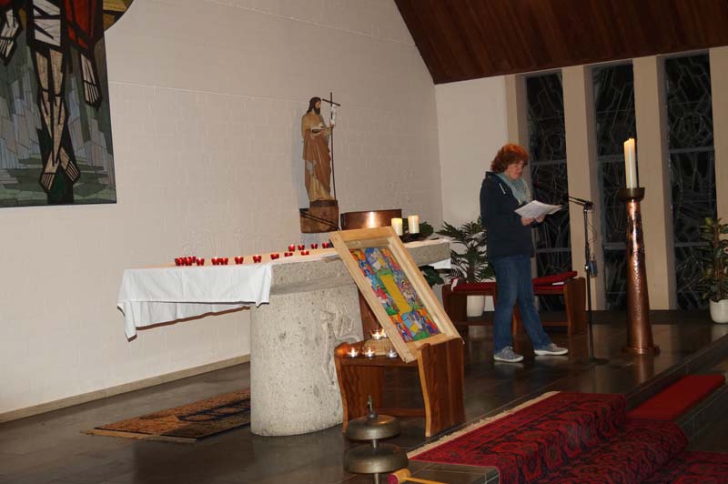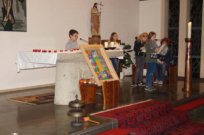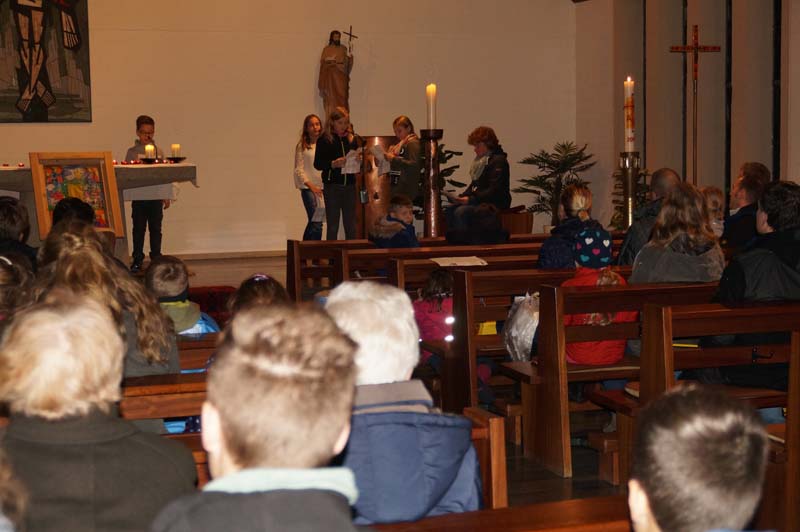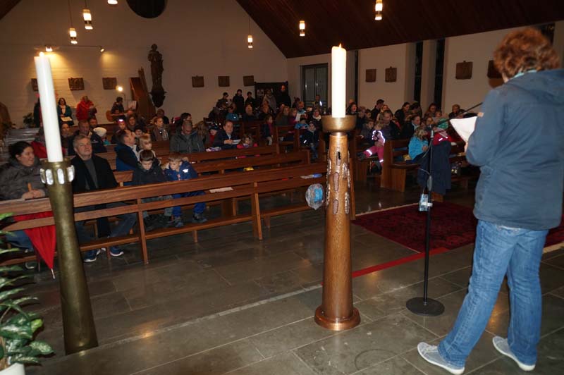 Das Licht was St. Martin unter die Menschen gebracht hatte war auch das Thema der Martinsfeier. Rita Wirtz-Fey erinnerte an die Zeit als St. Martin vor rd. 1700 Jahren lebte. Nur wenige Menschen konnten damals die Bibel und andere Schriften lesen. Die Kirchenfenster zeigten daher Heilige und Geschichten, die in den Menschen lebendig wurden, wenn das Licht durch sie in die Kirche fiel. In den Gilzemer Kirchenfenster sind Bilder der 12 Apostel zu sehen und die Messdiener hatten ein St. Martinsfenster gebastelt, was vor dem Altar stehend allen Licht spenden sollte.
