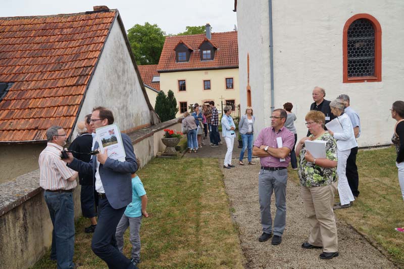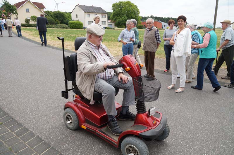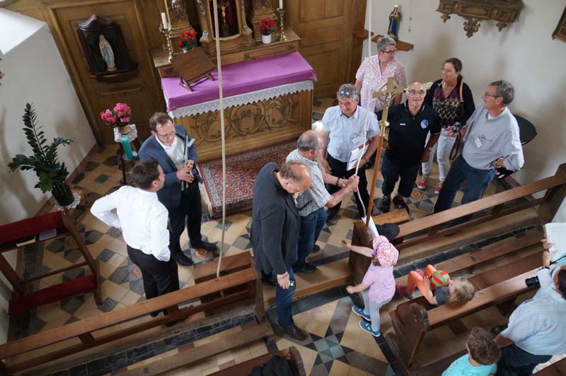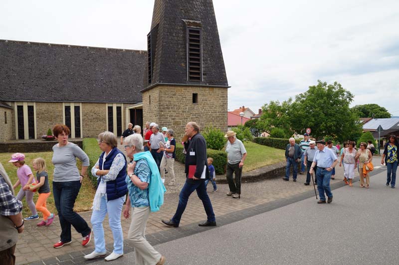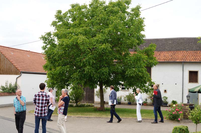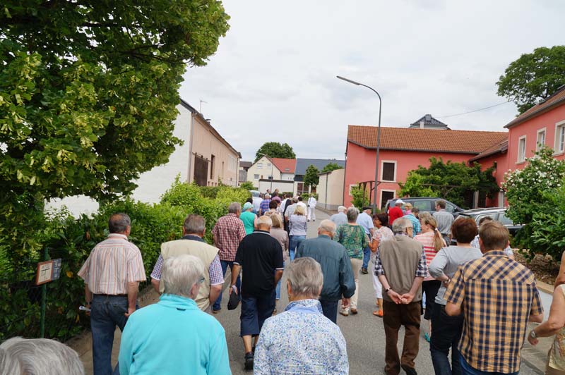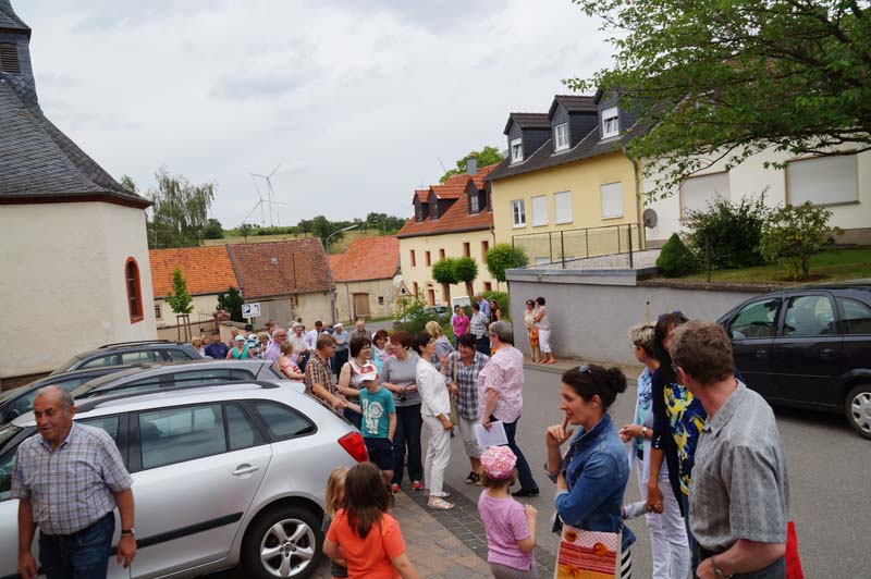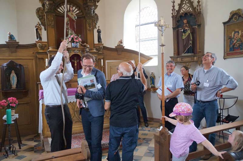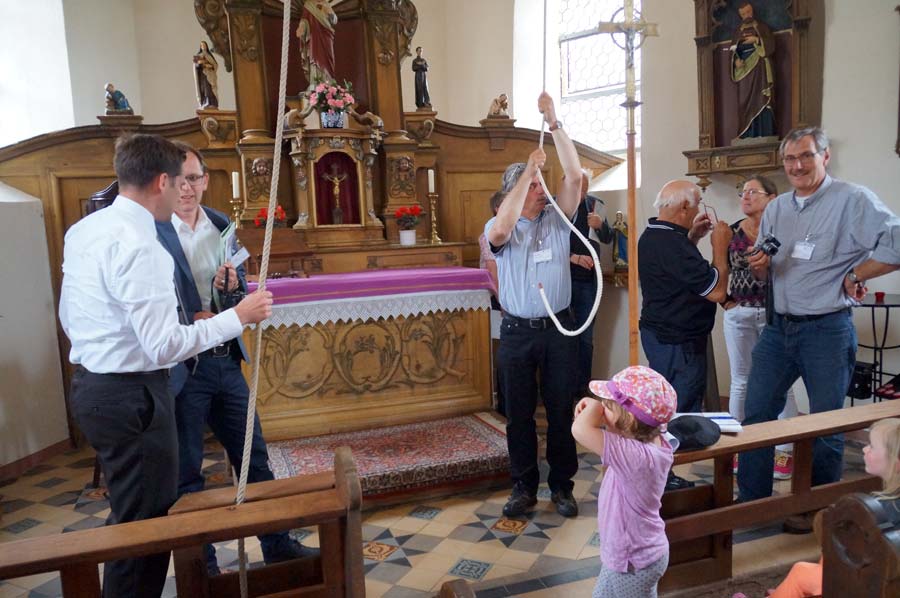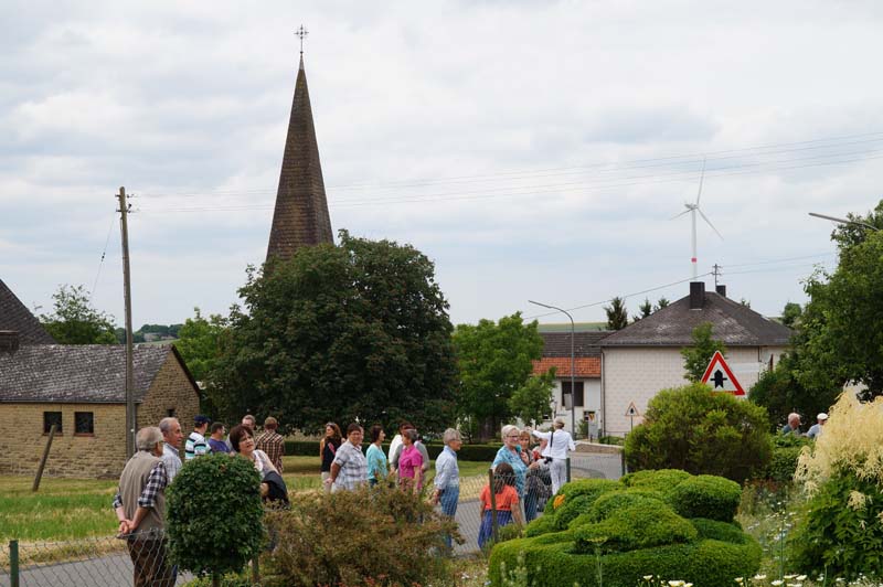 Der anschließende Rundgang durch Gilzem führte über die Eisenacher Straße zum Gemischt- und Lebensmittelgeschäft Dichter, über die Hauptstraße zum Kinderspielplatz, der neuen Kirche und dann zum dekorativen und natürlichen Bauerngarten der Familie Hoffmann.Entlang an schön renovierten ehem. Bauernhäusern und Grünanlagen führte der Weg zur alten Kapelle Johannes Baptist von 1782. Wie früher konnten hier die Jurymitglieder die Kirchenglocken an den Seilen läuten. Jurymitglieder die sich Bereiche außerhalb des Rundganges ansehen wollten, wurden zu ihnen gebracht.