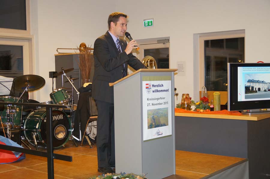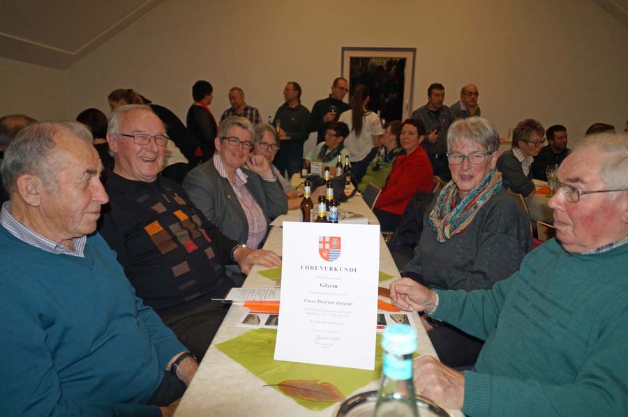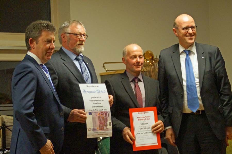 Am Freitag, 27.11.2015, waren alle aus dem Eifelkreis teilnehmenden Gemeinden im diesjährigen Wettbewerb zur Kreissiegerfeier ins Dorfgemeinschaftshaus in Geichlingen eingeladen. Es waren dies die Gemeinden: Badem, Euscheid (3. Platz), Fleringen, Geichlingen (1. Platz), Gilzem (2. Platz), Niederweis, Oberpierscheid in der Hauptklasse und Wolsfeld (1. Platz) in der Sonderklasse.
