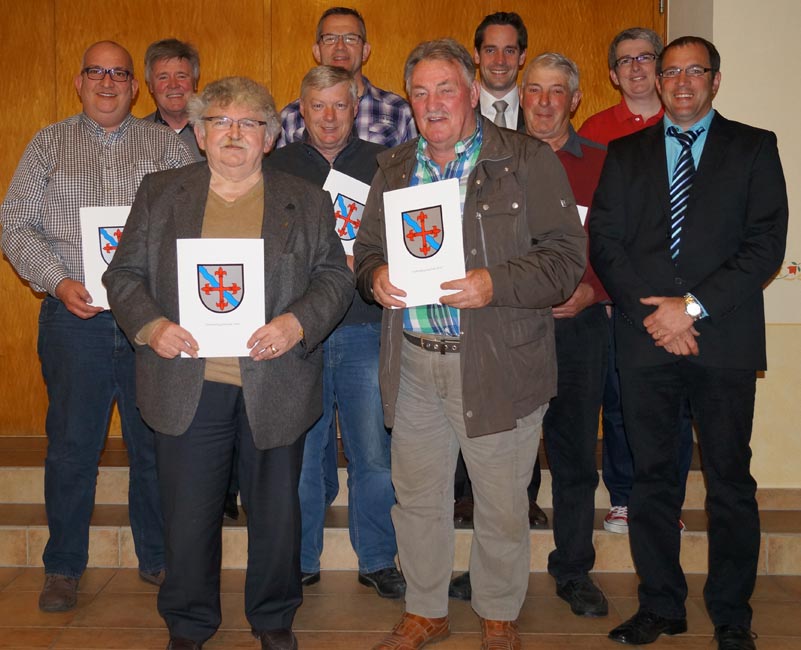 die Gemeinderatssitzung am 10.04.2014 überreichte Bürgermeister Moritz Petry an 5 Ratsmitglieder eine Ehrenurkunde des Gemeinde- und Städtebundes, zeichnete sie damit in Würdigung ihrer Verdienste um das Gemeindewesen aus.Eine Ehrenurkunde für 20jährige Mitgliedschaft im Gemeinderat erhielten: Rudolf Becker, Hans-Peter Harz und Peter Peters