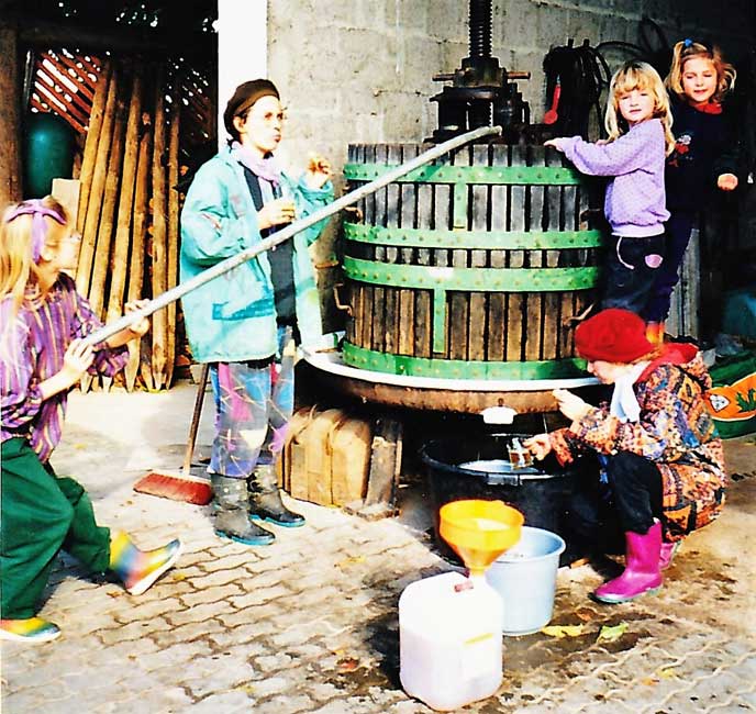 Nun mache ich seit 30 Jahren jedes Jahr, wenn es Äpfel gibt, meinen eigenen Viez, den ich zu jedem Abendessen genieße. Jedes Jahr schmeckt er ein bisschen anders, aber mir immer köstlich. Auch ich bin jedes Jahr ein bisschen anders und bleibe doch irgendwie dieselbe. Meine gute körperliche Verfassung und Gesundheit habe ich vielleicht auch ein Stück dem Viez zu verdanken.Viele Jahre habe ich meine vier Kinder von klein auf mit auf die Wiesen „geschleppt“.