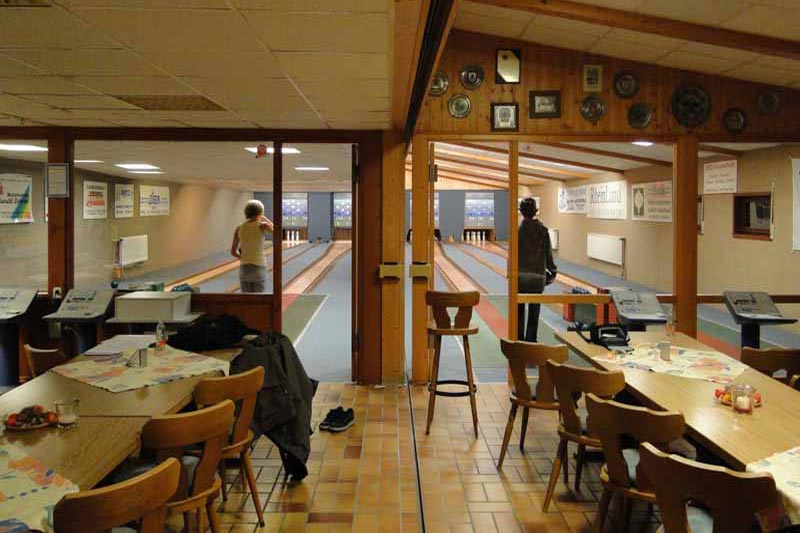 In Verlängerung an unseren Saal gab es schon seit den 30er Jahren eine Kegelbahn, auf der an Sonn- und Feiertagen zum Spaß und auch für Geld gespielt wurde. Für ein paar Groschen kamen Jungens aus dem Dorf zum Aufstellen der Kegel, und später durften wir Kinder aus dem Haus uns dort auch was verdienen.